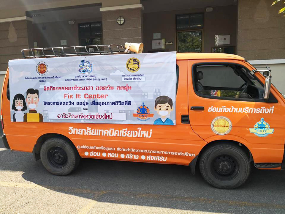 นายศุภชัย เอี่ยมสุวรรณ ผู้ว่าราชการจังหวัด เชียงใหม่ เป็นประธาน เปิดโครงการ จิตอาสา เราทำความดี ด้วยหัวใจ ภายใต้กิจกรรม อาชีวะอาสา ลดควัน ลดฝุ่น ภายใต้โครงการ ศูนย์ซ่อมสร้างเพื่อชุมชน (Fix it Center) เพื่อบรรเทา ความเดือดร้อนของประชาชน จากฝุ่นละออง ขนาดเล็ก ในจังหวัด ภาคเหนือ โดยสำนักงานคณะกรรมการ อาชีวศึกษา ได้สั่งการ ให้ประธานกรรมการอาชีวะศึกษา ภาคเหนือ ประสานงานกับ อาชีวศึกษาจังหวัด ทุกแห่ง ทางภาคเหนือ ดำเนินการ จัดตั้งศูนย์ ซ่อมสร้างเพื่อชุมชน เพื่อบริการ ทำความสะอาด ไส้กรองอากาศ เครื่องยนต์ พร้อมตรวจสภาพ เครื่องยนต์ เบื้องต้น สร้างการรับรู้ ให้ประชาชน มีความเข้าใจ ในปัญหาฝุ่นละออง ที่เป็นอันตารายต่อสุขภาพ